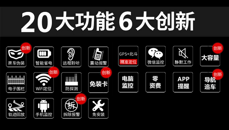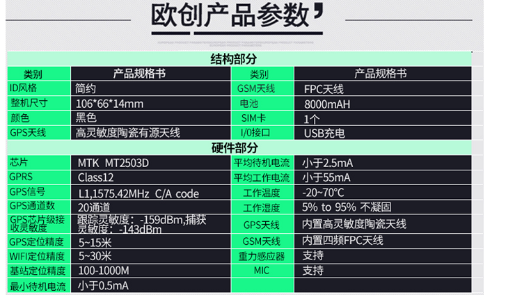 安裝:不用安裝,直接充電,充一次電用30天(通過調(diào)整回傳時間工作時間可以更長)北斗定位:屬于中國的衛(wèi)星,定位會比GPS準,誤差一般在5米內(nèi),但是覆蓋率不是非常的高,歐創(chuàng)芯片采用2503芯片兼容:北斗衛(wèi)星+GPS衛(wèi)星定位特點:定位會比單GPS更準